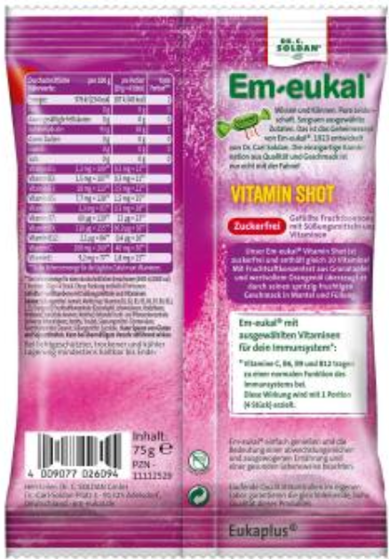 Em-eukal Vitamin Shot Sans Sucre Sachet 75 g - Bonbons aux Fruits avec 10 Vitamines