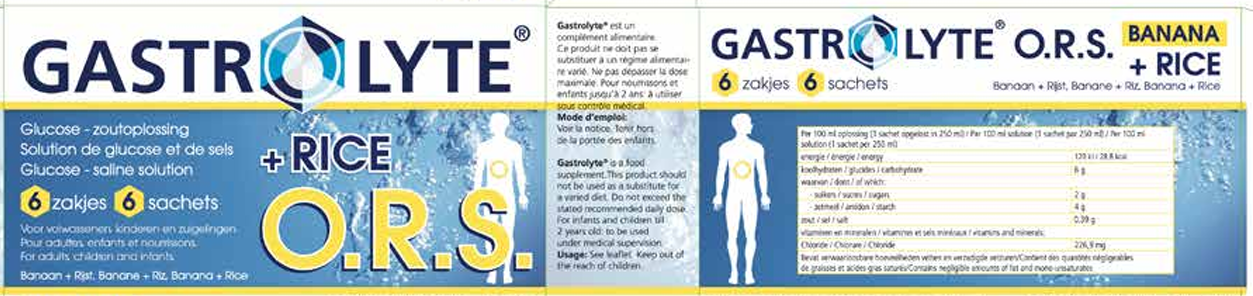 - Gastrolyte O.R.S. (Oral Rehydration Salts) Banana + Rice est un complément alimentaire, une solution de glucose, de sels et de riz