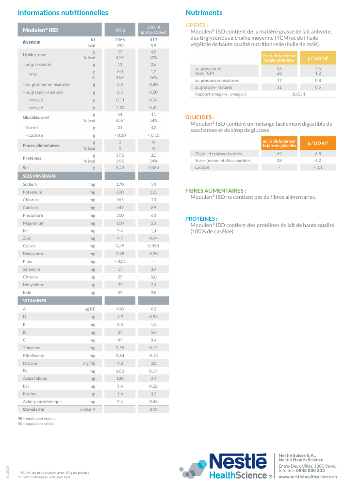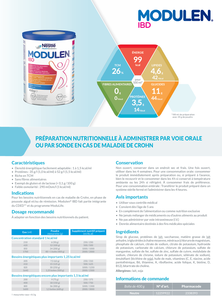 Modulen IBD est un mélange nutritif complet en poudre pour une reconstitution, isocalorique