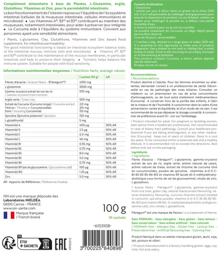 Fibres d’acacia - Fibregum™, L-glutamine, gamma-oryzanol extrait de son de riz, argile verte, arôme naturel de cassis, arôme naturel de fraise, extrait de rhizome de curcuma titré en curcuminoïdes, poudre de spiruline, vitamines A-DE-C-B1-B2-B3-B5-B6-B12 et vitamine B9 (acide 6S-5-méthyltétrahydrofolique sous forme de sel de glucosamine), citrate de zinc, L-glutathion.