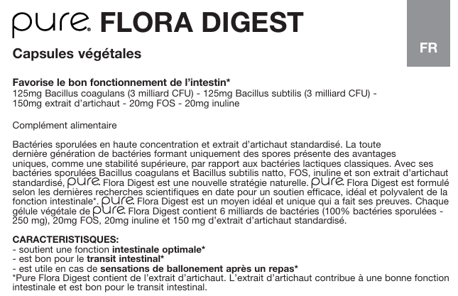 - Pure Flora Digest soutient une fonction intestinale optimale*, est bon pour le transit intestinal* et est utile en cas de sensations de ballonement après un repas*