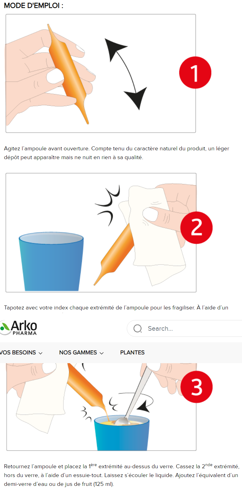- compte tenu du caractère naturel du produit, un léger dépôt peut apparaître. Il est donc préférable d’agiter l’ampoule avant de la diluer. Afin d’éviter la chute éventuelle de débris d’ampoule dans le liquide, ne pas casser l’ampoule au-dessus du verre