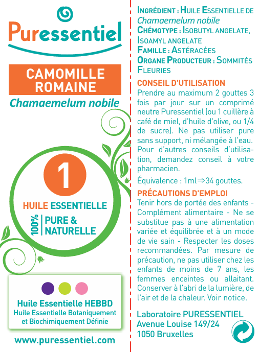 - prendre au maximum 2 gouttes 3 fois par jour d'huile essentielle de Camomille Romaine sur un comprimé neutre Puressentiel (ou 1 cuillère à café de miel, d'huile d'olive, ou 1/4 de sucre)