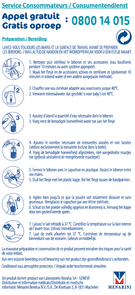 Maltodextrines, huiles végétales (palme, colza, tournesol, coprah), hydrolysat de protéines de lait, épaississants (pectine, gomme de caroube), amidon de tapioca, phosphate tricalcique, émulsifiant (lécithine de tournesol), chlorure de calcium, chlorure de magnésium, citrate tricalcique, bitartrate de choline, huile extraite de la microalgue Schizochytrium sp. (DHA), L-cystine, phosphate monocalcique, vitamines (A, B1, B12, B2, B6, B6, C, D3, E, K1, acide folique, acide pantothénique, biotine, niacine), citrate trisodique, phosphate dipotassique, L-tryptophane, pyrophosphate de fer, huile de Mortierella alpina (ARA), taurine, L-histidine, inositol, L-phénylalanine, L-carnitine, L-tyrosine, L-isoleucine, citrate tripotassique, sulfate de zinc, antioxydants (extrait riche en tocophérols, palmitate d'ascorbyl), sélénite de sodium, sulfate de cuivre, iodure de potassium, sulfate de manganèse