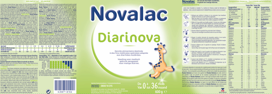 Novalac Diarinova poudre en pot de 600 g, aliment diététique innovant qui permet d’arrêter rapidement la diarrhée tout en veillant...