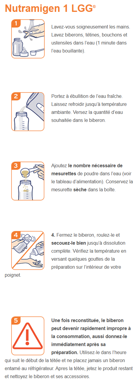 - une hygiène, préparation, dilution, utilisation et conservation appropriées sont importantes lors de la préparation de la formule