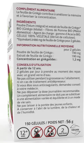 *Equivalant à 666 mg de feuille de Ginkgo pour 2 gélules.