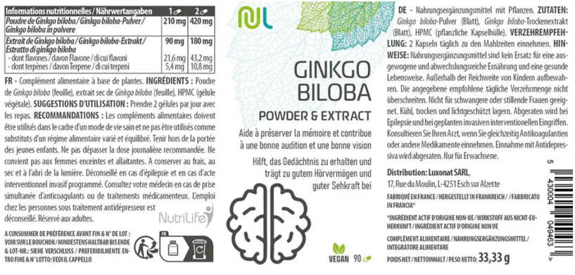 - NutriLife Ginkgo Biloba Extract est un complément alimentaire à base d'extrait sec de feuilles de ginkgo biloba (90 mg) standardisé à 24% de flavones et à 6% de terpènes