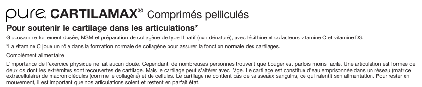 - Pure Cartilamax contenant glucosamine à haute dose, MSM, préparation de collagène natif de type II avec lécithine et cofacteurs vitamine C et vitamine D