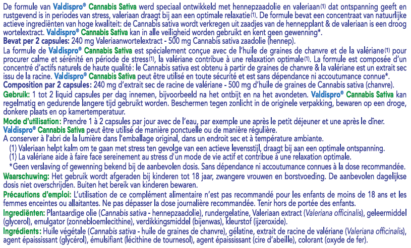 Valdispro Cannabis Sativa est un complément alimentaire spécialement conçue avec de l’huile de graines de chanvre et de la valériane, qui participe au calme et à la sérénité en période de stress et contribue à une relaxation optimale*